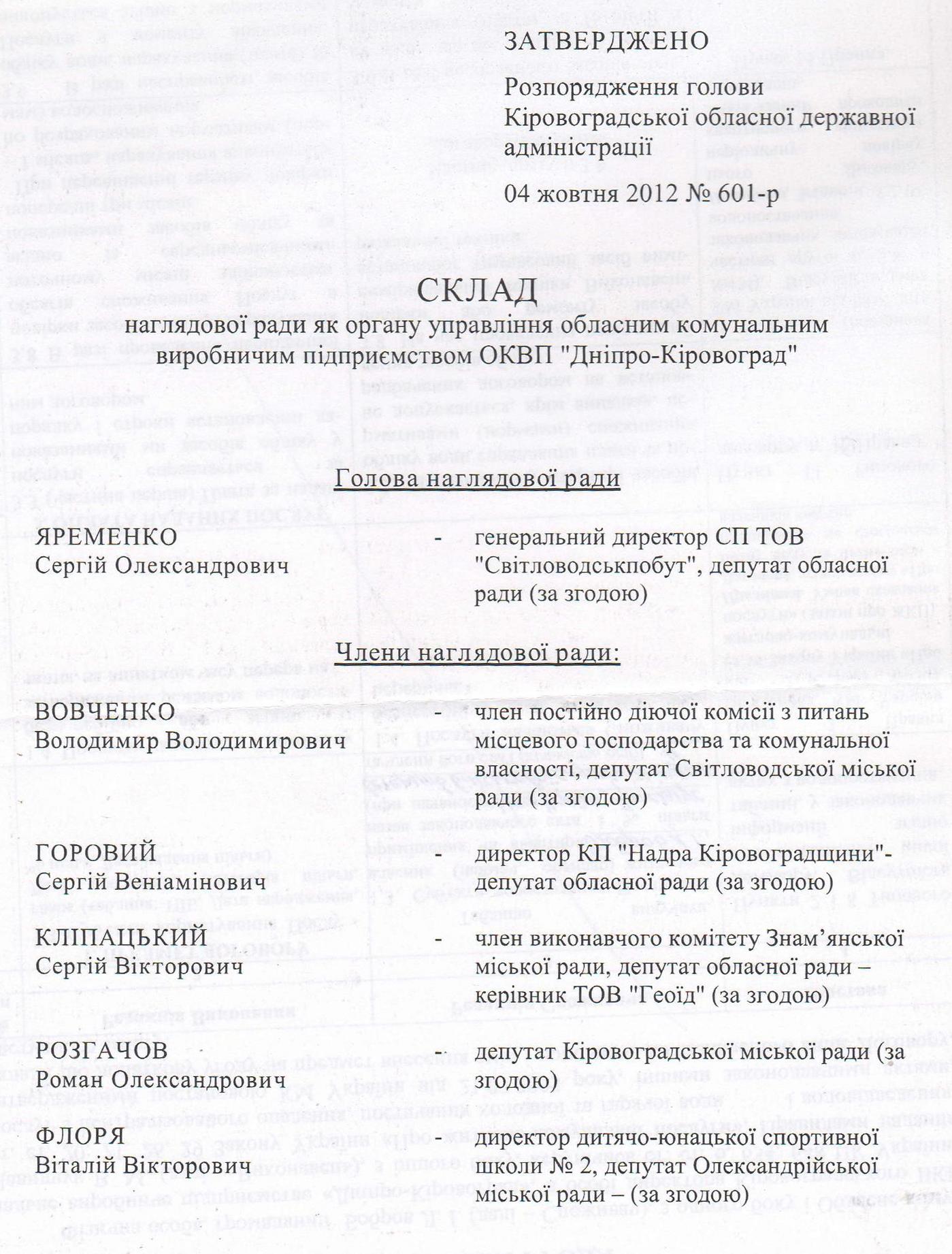 Голова тодішньої Кіровоградської ОДА С. Ларін, з посиланням на п. 7 згаданого рішення облради №189, видав розпорядження від 04.10.2012 №601-р. Слід зазначити, що, по-перше, цим пунктом таке доручення ОДА не надавалось взагалі. А по-друге, що суттєвіше, право змінювати форму управління обласним комунальним підприємством має лише обласна рада, а ніяк не ОДА, яка наділена лише правом забезпечувати галузеву політику підприємства.