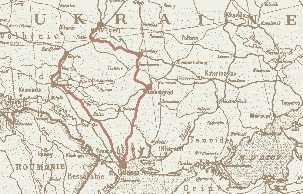 Подорож тривала з 8 вересня по 10 листопада і пролягла за маршрутом: Фастів — Миронівка — Корсунь — Сміла — Балаклея — Черкаси — Златопіль — Новомиргород — Єлисаветград (нині Кропивницький) — Бобринець — Вознесенськ — Одеса — Тульчин — Вапнярка — Жмеринка — Вінниця — Козятин