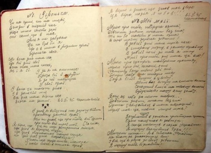 Наступного ранку для розшуку розбійників у село приїхали оперуповноважений Златопільського відділення міліції Григорій Антонов та оперуповноважений відділу карного розшуку обласного управління міліції з Кіровограда Євген Колесниченко. На одному з сусідніх городів вони знайшли зошит з ліричними віршами та піснями. Пісенник не був підписаний. На першій сторінці каліграфічно, але не жіночим почерком, переписаний вірш Володимира Сосюри: