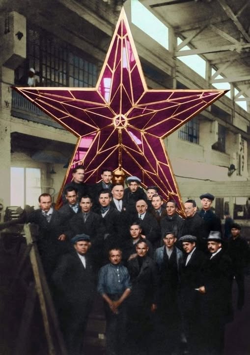 На фото: робітники вкраденого бельгійського заводу, що виготовили рубінові зірки для кремля...